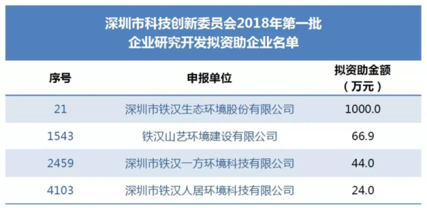 近日,为了贯彻落实深圳市委市政府《关于促进科技创新的若干措施》(深发〔2016〕7号)精神,根据《深圳市科技研发资金管理办法》等有关规定,深圳市科技创新委员会公示了2018年第一批企业研究开发资助计划拟资助企业的名单及金额,铁汉生态获得研发资助资金1000万。
