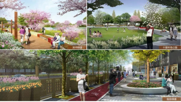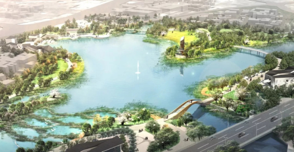 项目设计在保护原有生态基底的基础上,进行城市雨洪弹性调蓄、生物多样性修复,并配套公共服务设施,融入善水理念,通过水的图形形式,运用特色飞栈、步道等串联连接河道两岸空间,营造生态童趣、自然清新的河岸景观。