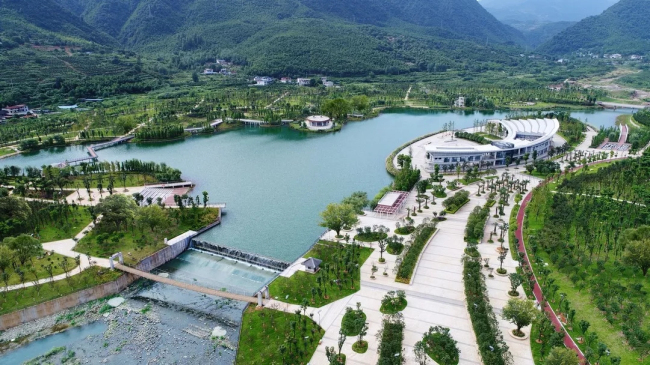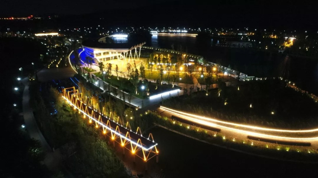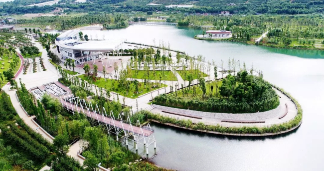 项目设计充分尊重场地原有山水骨架结构和山水文化,在公园区域内以大气的造景手法进行设计,使游人切实感受山水自然之美。对于西河流域的大量尾矿砂,铁汉生态营造生态景观的同时,运用公司独创的专利技术(用于土壤重金属污染的阻隔修复结构)来进行尾砂处理,通过物理阻隔、重金属安全固化稳定等工程措施,采取黏土覆盖、建立垂直和水平隔离层方法来切断土壤污染物的迁移扩散途径,并在上面覆盖2米深种植土,选用耐性植物对土壤基质进行改良。游客接待中心以“海绵城市”理念为指导,采用褶皱式太阳能板遮阴顶棚,具有雨水收集与太阳能发电双重功能,同时运用屋顶绿化,有效降低室内空调电量损耗,打造出了充分利用自然资源的绿色建筑。