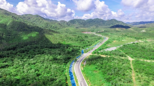 在深汕特别合作区的汕美生态文化谷,铁汉生态以一条44公里长的绿道,呈现出一张从自然到人文、从历史到现代的滨海新城名片,绿道特有的“蓝色”引人注目,它采用深蓝色冷色系的透水沥青混凝土路面,与汕尾“海洋生态”文化的特殊地理环境搭配呼应。在两旁绿草菁菁的边坡与各种鲜花植物的衬托下,仿佛一条一望无际的生态河流浮现在眼前,在炎热的夏季带给出行的人们一丝清凉。