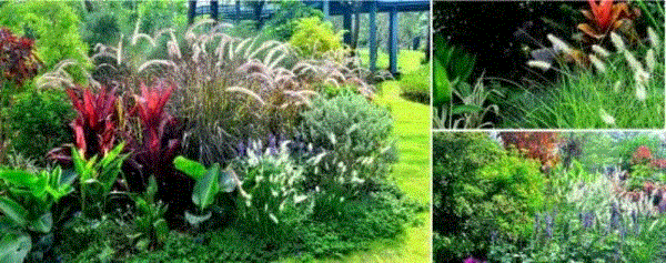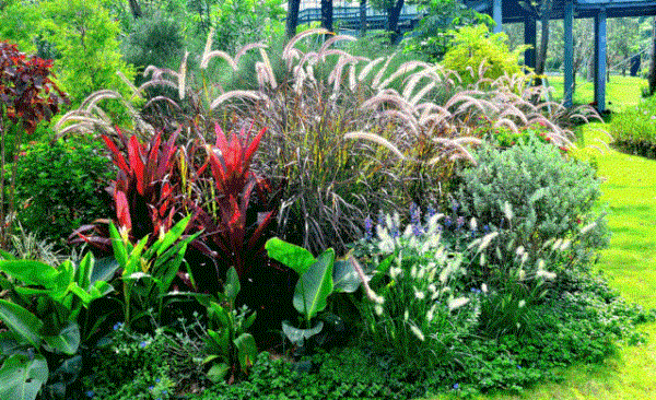 选择适合华南地区的观赏草,如紫叶狼尾草、羽绒狼尾草、小兔子狼尾草、糖蜜草、细叶芒等进行组团点缀,营造自然野趣的景观效果。