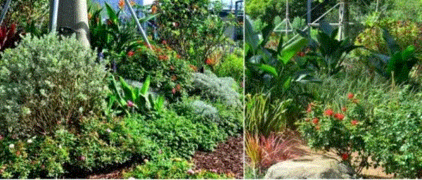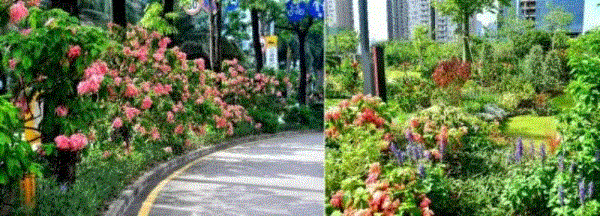 选用野牡丹系列品种:蔓性野牡丹、角茎野牡丹、钻石野牡丹、天骄野牡丹等。种植适合华南地区的多种月季品种:真宙、蓝色风暴、海洋之歌、公爵、果汁阳台、红色茶花女、黑伍德、玉玲珑、铃之妖精、艳粉玫瑰、钻石月季等。结合多种色叶开花植物:非洲芙蓉、烟火树、红花玉芙蓉、金英、紫叶香茶菜、蓝霸鼠尾草、花叶蜘蛛兰、珍珠马茶、百子莲、五彩蚌兰、太阳花、猫尾红、欧石竹等,形成特色花境组团。