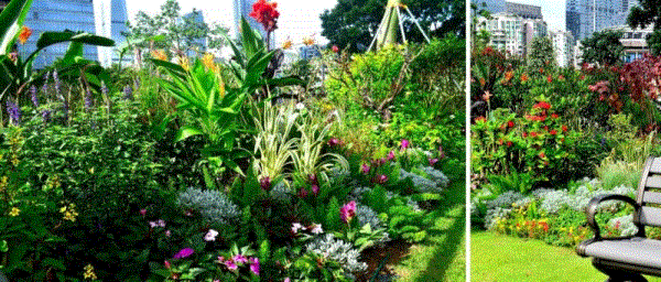 选取叶大花色丰富的蕉类、姜科类植物与龙舌兰类组成独具华南亚热带风情的花境组团,颜色艳丽的彩虹鸟蕉、鹤望兰、黄鸟蕉以及多种美人蕉,搭配热带宿根花卉姜荷花。