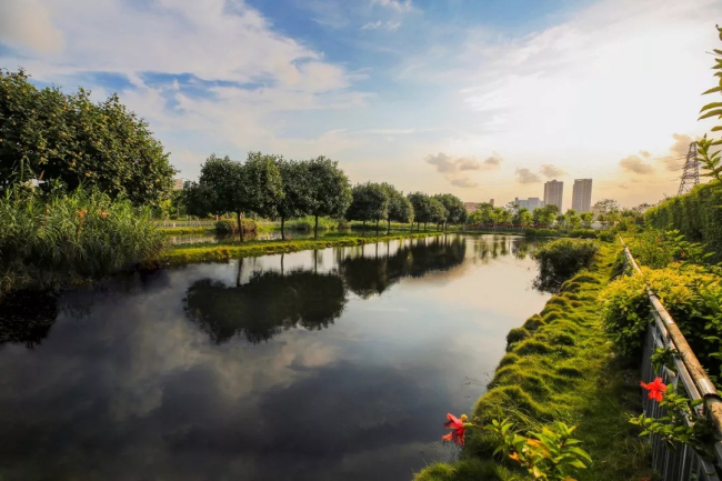 在该项目,铁汉生态用生态手法,建造稳定塘+生态快滤池+下行垂直流湿地+沉水植物景观出水调节池等处理工艺,对企业工业废水进行二次深度处理,达到地表水Ⅳ类标准后排入茅洲河,现已实现厂区废水“零排放”,并成为茅洲河消除黑臭的重要补水来源之一。