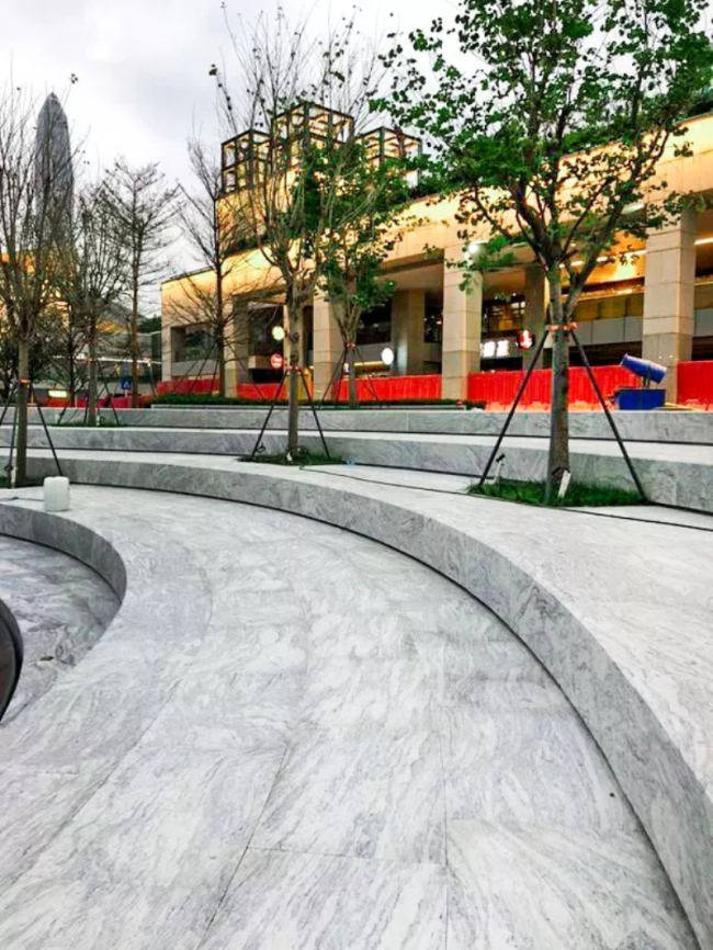 台阶石材选用了具有水墨画般纹理的威斯康白麻,自然的泼墨纹路令每一块石材的表现都各不相同,顺应纹理生长的方向铺贴在一起,有一种传统山水画般的意境,庄严又灵动,呼应“秉礼”的主题。