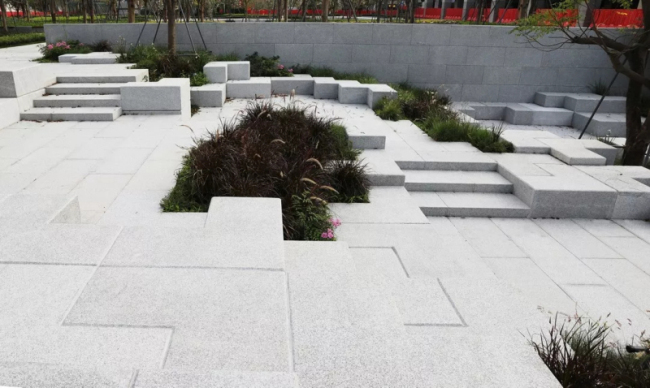 相对静思池的静谧,明德台是动感的。明德台为少年宫和书城的孩子们提供了一个活泼的空间,这里既可以是他们的户外课堂,也可以是绿荫笼罩下的游乐场,是寓教于乐的好地方。明德台似台又非台的形体,看似是简单的折板,但由于两侧倾斜角度不同,同时为了达到大小拼缝交错的视觉效果,使得这一区域也产生了超过20种规格的石材变化。