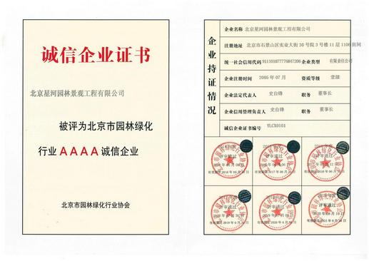 本次“诚信企业”评定是由北京市园林绿化行业协会本着公开、公正、公平的原则,按照“北京市园林绿化行业诚信企业评定办法”等级评定标准,组织专家进行严格评定。该评选结果将纳入北京市诚信企业信息库和北京市公共信用信息服务系统,是企业招投标、施工、评优的重要参考。此次申报的企业共171家,在新冠肺炎疫情影响的大环境下,星河园林能够被评为“4A诚信企业”,彰显出企业较强的风险防范能力,更体现了行业对企业诚信建设工作的高度认可和肯定。