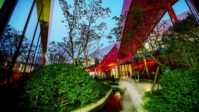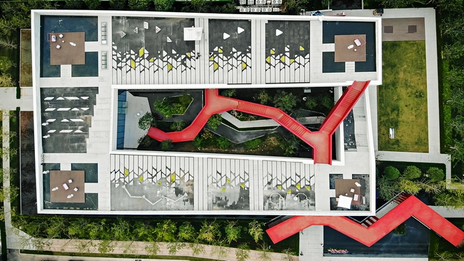 空间是时间的容器。中庭空间内,多组楼梯分割空间,盘旋如蛟龙一般。折线巷道移步易景,园中见绿,园中见石,园中见水,营造出城市山林空间。