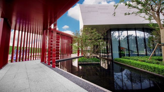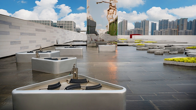 水院空间“天际水池”以水光一色的天赋胜境与湾界场景,呈现出顶奢的人居空间,艺术雕塑点缀于大尺度静水面之上,整个景观空间生动而幽静。为了打造出如此精致的景观,施工过程中,首批种植的18颗银杏,只保留6颗,剩余全部退场处理。这种果断的取舍,保证了银杏的整齐和标准。周边银杏等栽植围绕水,通过行植的手法,突出植株的气势和整齐之美,远望过去气势非凡。