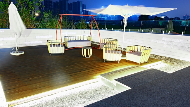 花园一角设置了休闲区。藤制的户外桌椅、现代的遮阳伞、明亮跳色的棉麻抱枕,无一不彰显出舒适、轻松、质感的现代生活情调。夜幕来临时,暖黄的灯带更加衬托出一丝温馨的情怀。