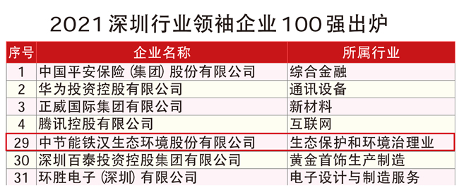 中节能铁汉蝉联“深圳行业领袖企业100强”