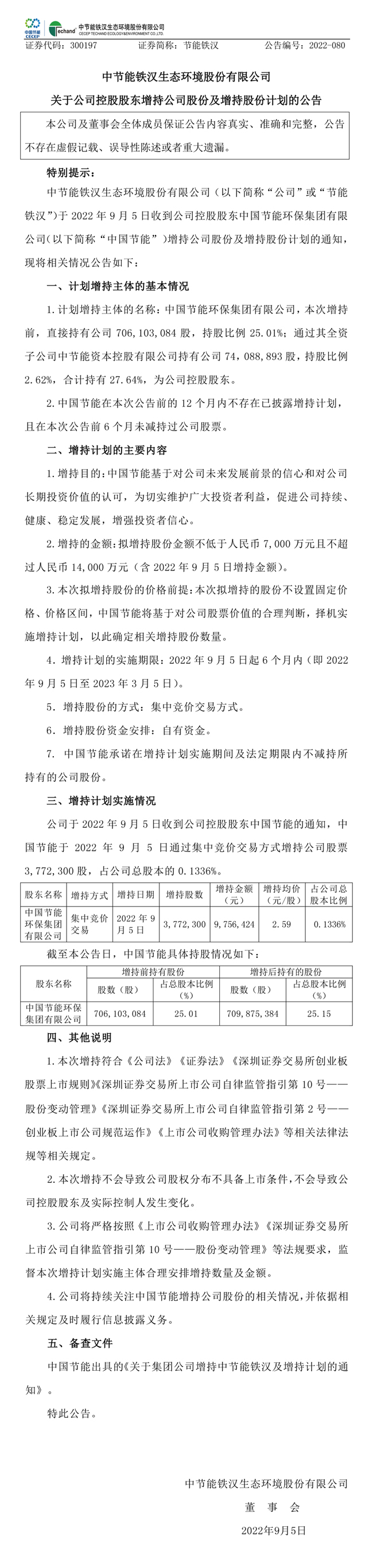 据中节能铁汉生态环境股份有限公司(证券简称:节能铁汉,证券代码:300197)2022-080号公告显示,即日起,公司控股股东——中国节能将以集中竞价交易方式增持公司股份金额不低于人民币7,000万元且不超过人民币14,000万元(含2022年9月5日增持金额),增持计划的实施期限为2022年9月5日起6个月内(即2022年9月5日至2023年3月5日)。
