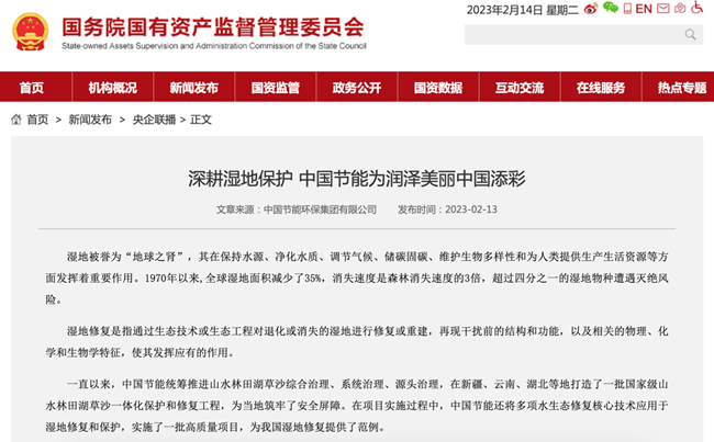 2月13日,国务院国有资产监督管理委员会网站“央企联播”栏目刊登了“深耕湿地保护 中国节能为润泽美丽中国添彩”的文章,肯定了中节能铁汉湿地修复和保护工作。