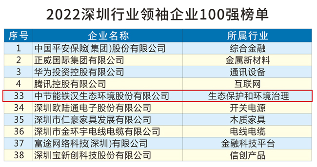 中节能铁汉连续四年蝉联“深圳行业领袖企业100强”