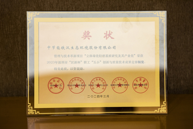 412日,由深圳市质量协会主办的质量创新促企业高质量发展大会在深圳市南山区举行,并为2023年深圳市“匠新杯”职工“五小”创新与质量技术成果竞赛获奖单位颁奖。中节能铁汉管理与技术革新项目“立体绿化轻型基质研究及其产业化”荣获该项赛事铜奖。