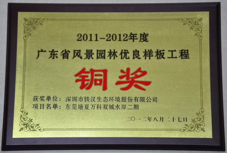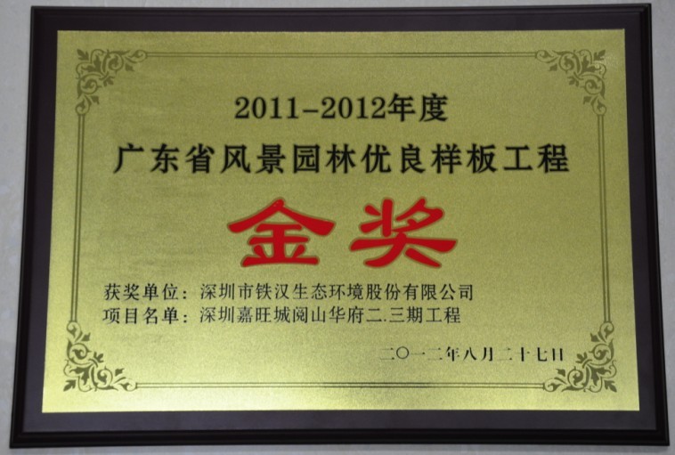 在2011—2012年度广东省园林优良样板工程项目评比中,铁汉生态承接的嘉旺城阅山华府二、三期工程被评为2011-2012年度广东省园林优良样板工程金奖;东莞塘夏万科双城水岸二期评为2011-2012年度广东省园林优良样板工程铜奖。
