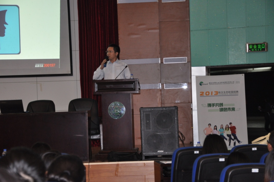 2012年11月13日,由公司副总裁、成本合约中心总经理陈阳春带队的2013年铁汉生态校园招聘小组,在华南农业大学、仲恺农业工程学院举办以“携手共创,绿色未来”为主题的宣讲会,广州是铁汉生态校园招聘的第一站,标志着公司2013年校招工作正式启动。