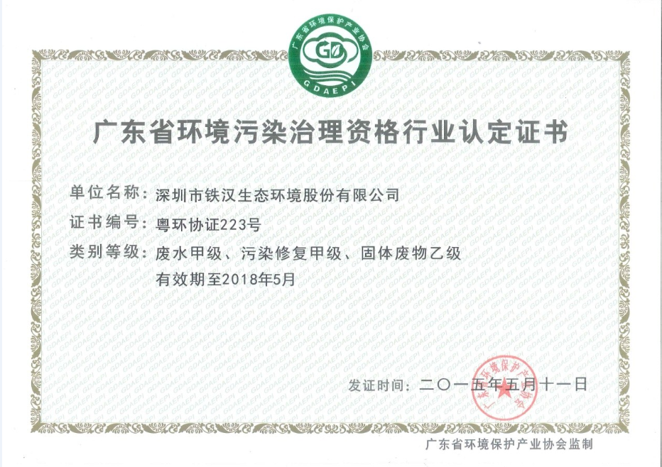 近日,铁汉生态收到由广东省环境保护产业协会颁发的《广东省环境污染治理资格行业认定证书》,获得“废水甲级”、“污染修复甲级”和“固体废物乙级”资质,标志公司在环境保护和污染治理方面取得新突破。