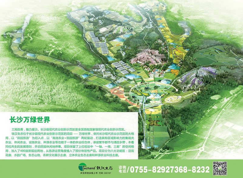 三湘首善,魅力星沙。铁汉生态位于长沙县现代农业创新示范区的项目——万绿世界,依托长沙现代农业示范区的大格局,以“田园旅游”为切入点,以“高效农业+田园旅游”两轮驱动,打造具有区域影响力的集观光农业、休闲农业、设施农业、种源农业等功能于一体的农业综合体,承接繁华都市与清丽乡野,本着同位共生的发展原则,开启田园休闲地序幕。项目保留了上位规划中“一轴、一核、三廊”的空间格局,加入了400亩新规划用地,从旅游运营角度植入了部分体验性产品。项目分为六大功能区:迎宾花廊、水韵广场、生态山地、农耕文化展示走廊、立体农业生态走廊和种源农业科技走廊。