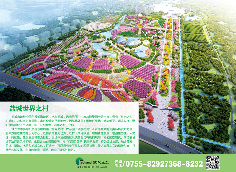 铁汉生态参与投资建设的城南“世界之村”农示园“四季花海”正在为盐城的优美环境贡献力量。整体方案以生态建设为核心,以创新体制为动力,以扩大成片绿量、增加森林资源、增强生态性、人文性、持续性、建设宜居城市为目标。设计中我们通过系统整合与有机的规划,将公园以现代、简洁的设计手法打造风格明确、主题突出的景观空间,将“花海染四季 锦缎映彩园”作为设计主题。融合花海、花林、草地、水系和地域文化,打造一个可以具有美不胜收的四季花景,传达浪漫主义的精神形态,并展示盐城文化中独有的激情、潇洒、自由的标识性地区。