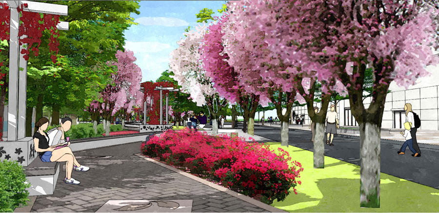 项目以香港市花紫荆花和深圳市花勒杜鹃为设计灵感,种植一条以两地市花为主的缤纷花带,贯穿于整个场地,形成一条软化的红色纽带;设计一条铭刻深港重要事件的双花游园步道连通场地,加入两地市花演化的设计元素,形成一条具象的红色纽带,突出 “连接深港纽带”的历史文化主题,传播两地特色文化,促进文化交流和社会可持续发展。