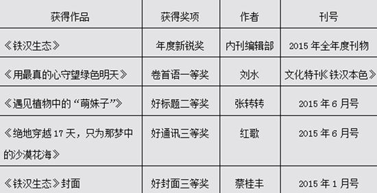 凭借这4期内刊参评2015年度深圳内刊传媒奖,《铁汉生态》收获的奖项无论是在“质”还是“量”上都取得了突破:1项年度大奖+1项一等奖+1项二等奖+2项三等奖,实现了“大满贯”的获奖组合。