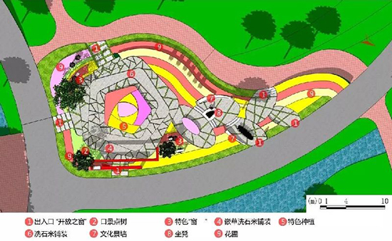 园区主入口采用具有深圳代表性的莲花山公司大门的设计——“改革开放之窗”,开放的框架结构体现了深圳“开拓创新”的城市精神。设计上设置多处便捷的交通出入口,场地地势从东南到西北渐渐升高,形成台地花园。园中央“花蕊处”设计特色种植池,成为视觉焦点,叶子处两处景墙叙述月季文化历史,为来自世界各地的月季爱好者一展“鹏城月季芳容”。