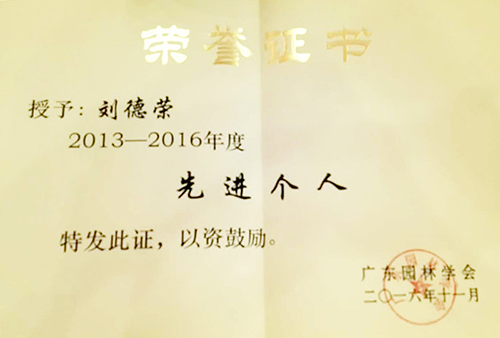 刘德荣获“2013-2016年度广东园林学会先进个人”荣誉称号
