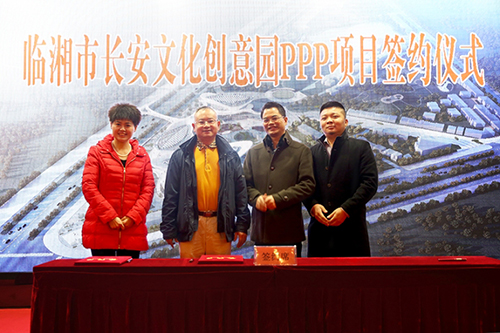 临湘市人民政府副市长熊丽女士、深圳市铁汉生态环境股份有限公司董事长刘水先生、广东省南兴建筑工程有限公司总经理林进宇先生、深圳市华纳国际建筑设计有限公司委托代理黄灿先生共同签订长安文化创意园PPP项目政府与社会资本合作协议