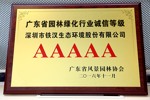 荣获“2016年度广东省园林绿化行业诚信评价AAAAA等级企业”,再次收获行业信用评价最高等级奖项,是对铁汉生态始终坚持诚信经营的认可,更反映了铁汉生态良好的市场口碑与形象。