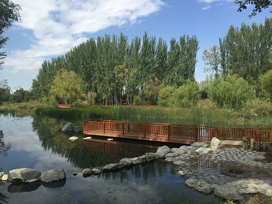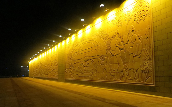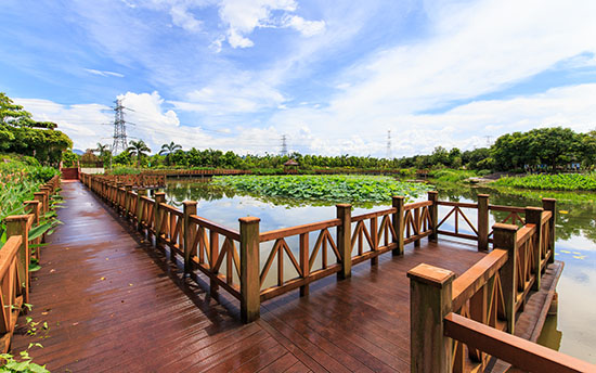 亲水公园以亲水平台和亲水栈道为主题景观,巨大平台围墙上立着有三幅浮雕,由具有防水功能的云南黄色砂石岩雕刻而成,客家围龙屋、客家古民居、客家节庆习俗等客家元素囊括其中,独具当地文化风味。而600多米长的亲水栈道结合生态自然,造一条活力开放、自然亲水的休闲绿廊。铁汉生态将其打造为以“亲水、生态、自然、休闲”为主题的城市生态休闲空间,独具区域特色的亲水景观也让梅州居民放慢生活节奏,尽享亲近自然的舒适美好。