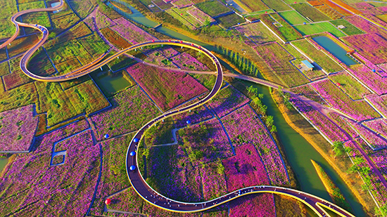 其中,由铁汉生态承建的“衲田花海”是三台山公园最具特色的区域,主要包括花海、走秀场、生态民俗村等,占地约2200亩,共有大小田块612块,采用不同类型和色彩的花田拼接而成,形成各具特色的四季花海景观。