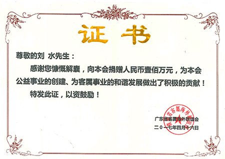 为了更好地支持客属社团的发展,刘水捐款人民币100万元作为广东省客联百师公益服务团及“客家百师智库”启动资金。
