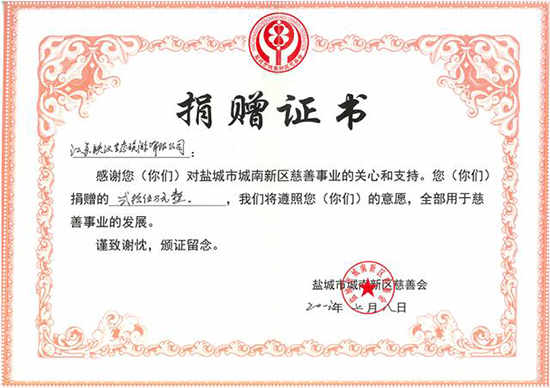 - 江苏铁汉生态旅游有限公司向盐城阜宁灾区捐款25万。