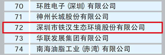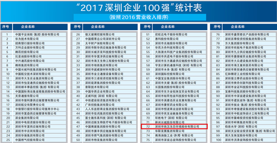 由深圳市企业联合会与深圳商报共同主办的“2017深圳企业100强”排行榜日前公布。深圳市铁汉生态环境股份有限公司凭借卓越的实力入围榜单,位列第72位,较去年上升17位,是唯一一家入围的生态环保企业。