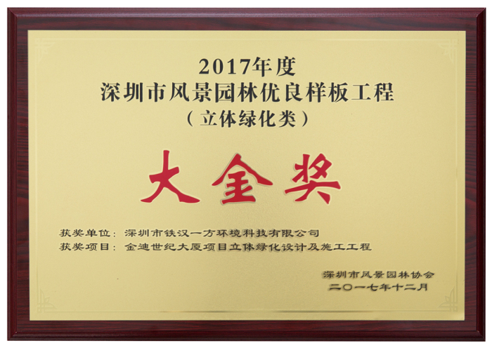 “金迪世纪大厦项目立体绿化设计及施工工程”获优良样板工程(立体绿化类)大金奖