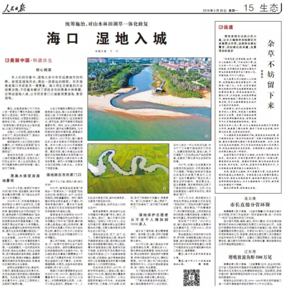 5月28日,铁汉生态的首个黑臭水体治理PPP项目再度登上《人民日报》,该报发表文章《海口 湿地入城》,报道了该项目以生态修复的手法,把昔日黑臭的海口东西湖,变成了市民青睐的美丽湿地,成为了海口用生态修复的方法统筹治理、解决黑臭水体难题的代表作,体现了海口在生态修复、城市湿地建设保护方面的决心和努力,得到了联合国湿地公约组织秘书长的点赞。