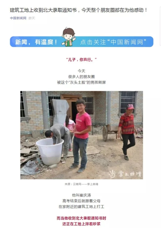 据媒体报道,今年高考,学文科的崔庆涛考了669分,被北京大学新闻与传播学院专业录取。7月22日,邮递员将北京大学的录取通知书送到崔庆涛手上的时候,家境贫困的他正在工地上当泥工,与他一同干活的还有他的父母,刚上四年级的妹妹在一旁玩耍。