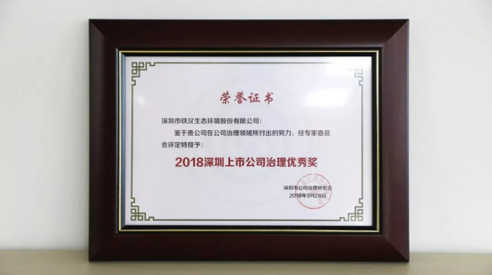 ▲铁汉生态荣获“2018深圳上市公司治理优秀奖”