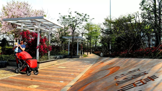 铁汉生态的深圳市福田口岸“红纽带”公园景观设计项目以香港市花紫荆花和深圳市花勒杜鹃为设计灵感,种植一条以两地市花为主的缤纷花带,贯穿于整个场地,形成一条软化的红色纽带;设计一条铭刻深港重要事件的双花游园步道连通场地,加入两地市花演化的设计元素,形成一条具象的红色纽带,突出“连接深港纽带”的历史文化主题,传播两地特色文化,促进文化交流和社会可持续发展。“深港携手绘浪漫,双花交映展缤纷”,项目得到专家们的一致好评。