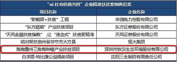 11月12日,第三届“αi社会价值共创”中国企业社会责任卓越案例评选颁奖典礼在上海举行,铁汉生态开展的“海南儋州三角梅种植产业扶贫项目”荣获企业精准扶贫案例典范奖。