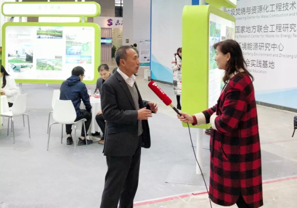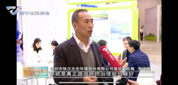 ▲铁汉生态高级副总裁李诗刚在铁汉生态展位接受南宁电视台记者采访