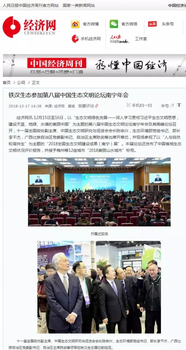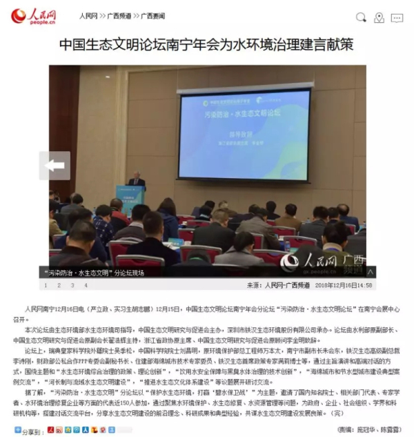 年会及分论坛举办期间,铁汉生态的绿色生态展位、生态治理的独特技术创新优势和水环境综合治理方面的创新思路和成功案例,引起了央媒和当地媒体的广泛关注,经济网、人民网、南国早报、南宁电视台、南宁日报、南宁晚报等主流新闻媒体先后竞相报道,集中展示了铁汉生态的核心优势和综合实力。