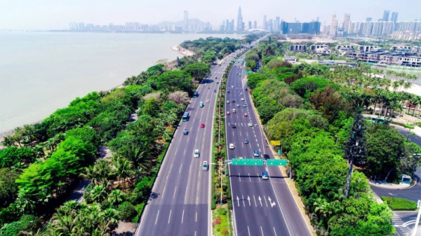 该工程跨深圳市福田区、南山区,与11号线红树湾站对接。滨海大道两边种植木棉花、风铃木,中间绿化隔离带多采用绿化组团布景,黄金叶、红檵木、红叶石楠、龙舌兰、非洲茉莉等均使用球状进行组团,散尾葵、狐尾椰子及中东海枣间隔其中,热带景观表现得淋漓尽致,色彩明亮、高低错落有致。