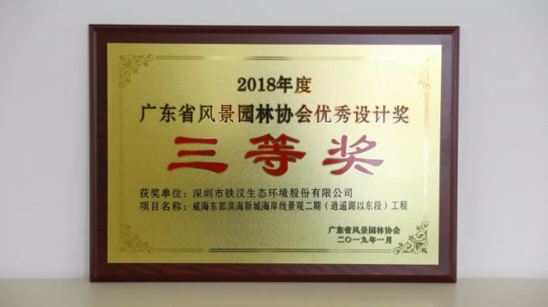 会上,公司的“新疆伊宁市后滩湿地棚户区改造工程”荣获“2018年度广东省风景园林协会优秀设计二等奖”,“威海东部滨海新城海岸线景观二期(逍遥湖以东段)工程”荣获“2018年度广东省风景园林协会优秀设计三等奖”及“铜陵市大通特色小镇规划项目编制”荣获“2018年度广东省风景园林协会优秀规划三等奖”。