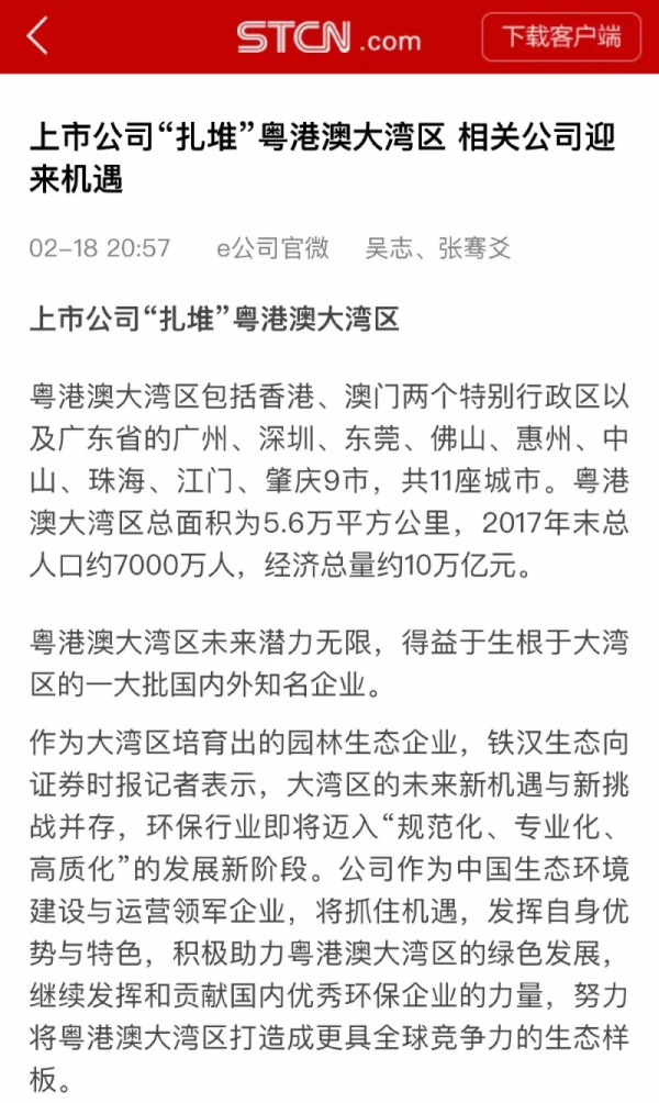 《粤港澳大湾区发展规划纲要》印发 铁汉生态迎来发展新机遇