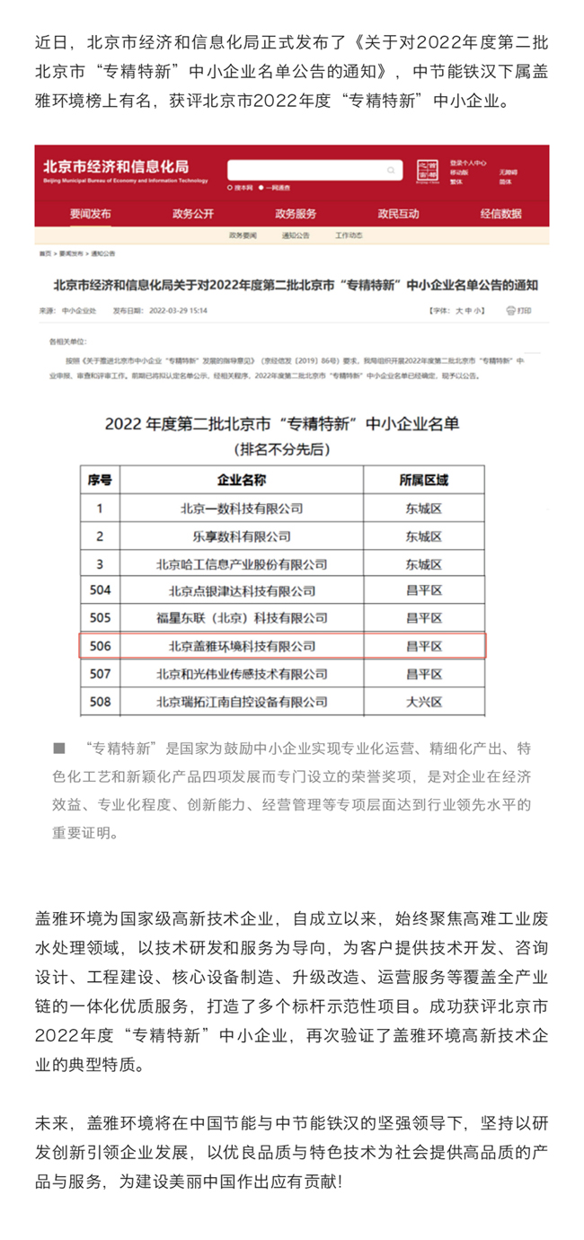 中节能铁汉下属盖雅环境获评北京市2022年度“专精特新”中小企业