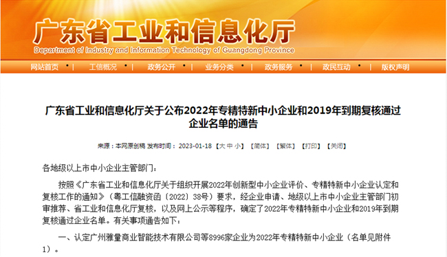 同时,根据广东省工业和信息化厅发布的《关于公布2022年专精特新中小企业和2019年到期复核通过企业名单的通知》,铁汉环保被认定为广东省2022年度专精特新中小企业,有效期自公布之日起三年。“专精特新”中小企业是指实现专业化、精细化、特色化发展、创新能力强、质量效益好的优质企业。本次“专精特新”中小企业评选是广东省工信厅基于从事特定细分市场年限、研发费用总额、研发强度、营业收入等基本条件,选拔出创新能力强、市场占有率高、质量效益优的排头兵。