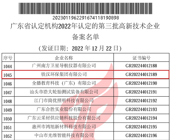 日前,中节能铁汉环保集团有限公司(以下简称铁汉环保)收到全国高新技术企业认定管理工作领导小组办公室发布的《关于对广东省认定机构2022年认定的第三批高新技术企业进行备案的公告》,根据《广东省认定机构2022年认定的第三批高新技术企业备案名单》,铁汉环保已通过高新技术企业认定。这是自2016年起,铁汉环保连续第三次通过国家高新技术企业认定。