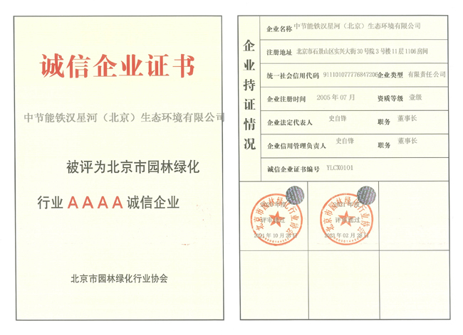 “诚信企业”是北京市园林绿化行业为提高园林绿化企业的综合素质、树立良好形象,提高在社会活动中的诚信度,增强企业的守法和信用意识而建立起的重要行业标准。诚信企业评定是企业招投标、施工、评优的重要参考,也是对铁汉星河在园林绿化领域经营成果与综合实力的高度认可和肯定,彰显了铁汉星河诚信精工的企业形象和品牌影响力。